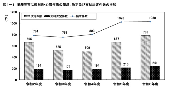 これによると、脳・心臓疾患の労災請求件数は1030件、支給決定件数は241件と、3年連続で増加し高水準が続いています。