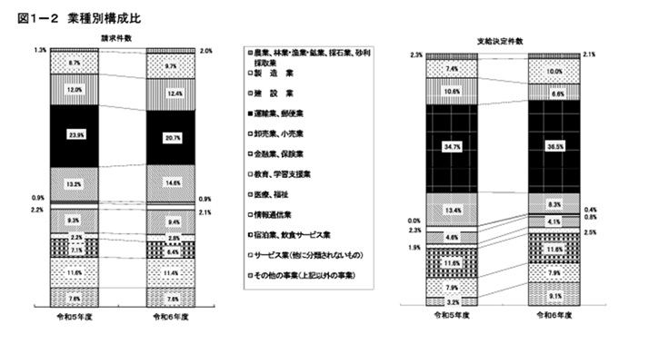- 支給決定件数は、「運輸業、郵便業」88件、「宿泊業、飲食サービス業」28件、「製造業」24件の順に多いという結果になりました。