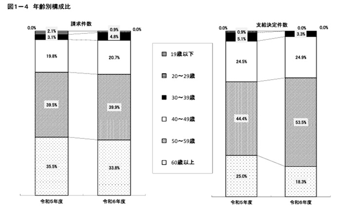 - 支給決定件数は「50~59歳」129件、「40~49歳」60件、「60歳以上」44件の順に多いという結果になりました。
