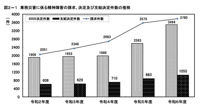 精神障害の労災請求件数は、3780件、支給決定件数は1055件となり、ともに過去最多を更新しました。支給決定件数が1000件を超えたのは初めてであり、6年連続の増加となっています。
