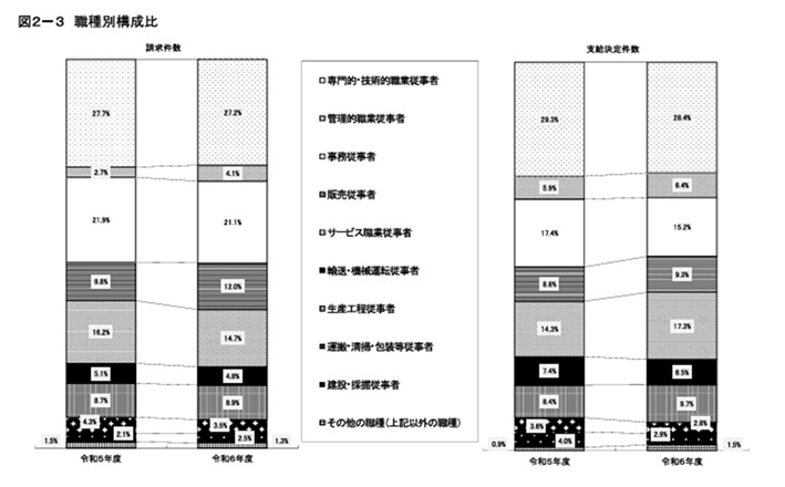 - 支給決定件数は「専門的・技術的職業従事者」300件、「サービス職業従事者」182件、「事務従事者」160件の順に多いという結果になりました。